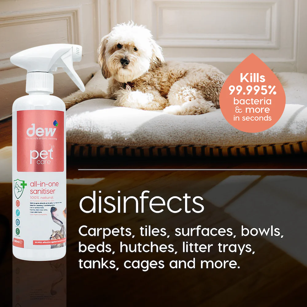 - SIMPLE TO USE: Spray solution on the stain or mess and wait 10-30 seconds for Dew to work, then wipe clean. Safe to use in cages, kennels & cat litter trays to carpets, beds, fabric, hard floors, grass and all surfaces for a happy pet & happy home