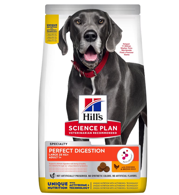 Hill’s Science Plan PERFECT DIGESTION LARGE BREED Adult dog food with Chicken & Brown Rice Contains ActivBiome+, a Hill’s exclusive blend of prebiotics to help rapidly nourish & balance your pet’s unique microbiome.